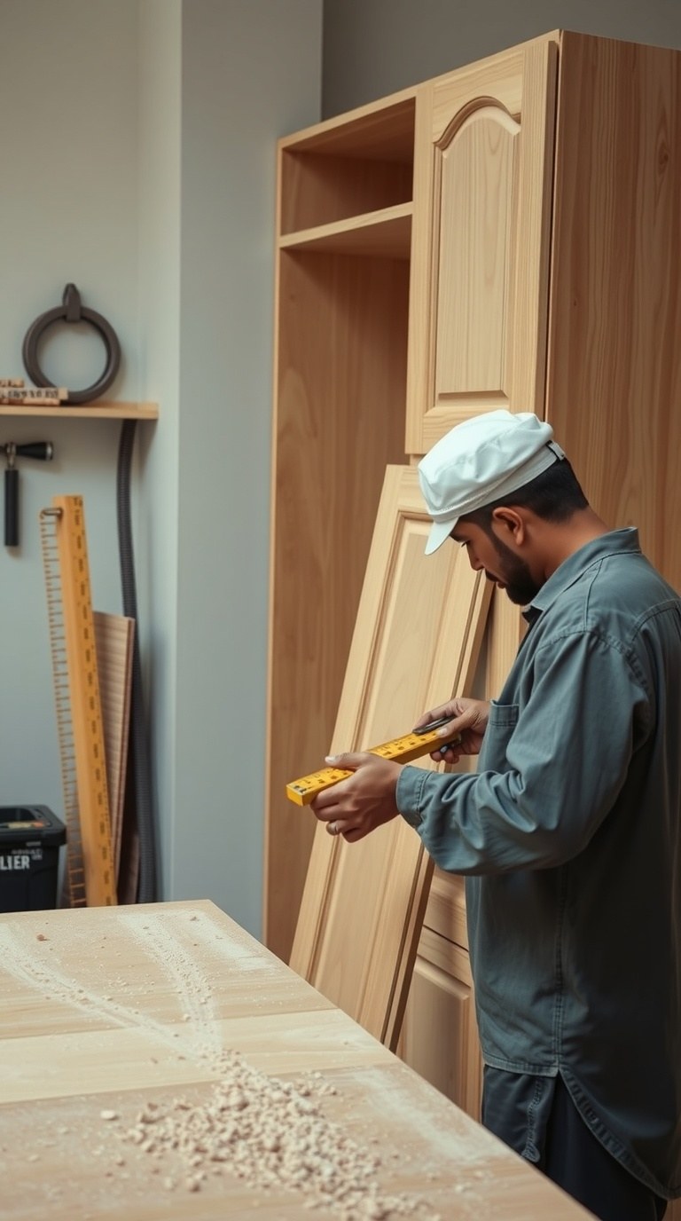 مطبخ جديد أو تجديد للمطبخ القائم — نصنع الخزائن العلوية والسفلية ونثبّتها بدقة مع فتحات للأجهزة المبنية.